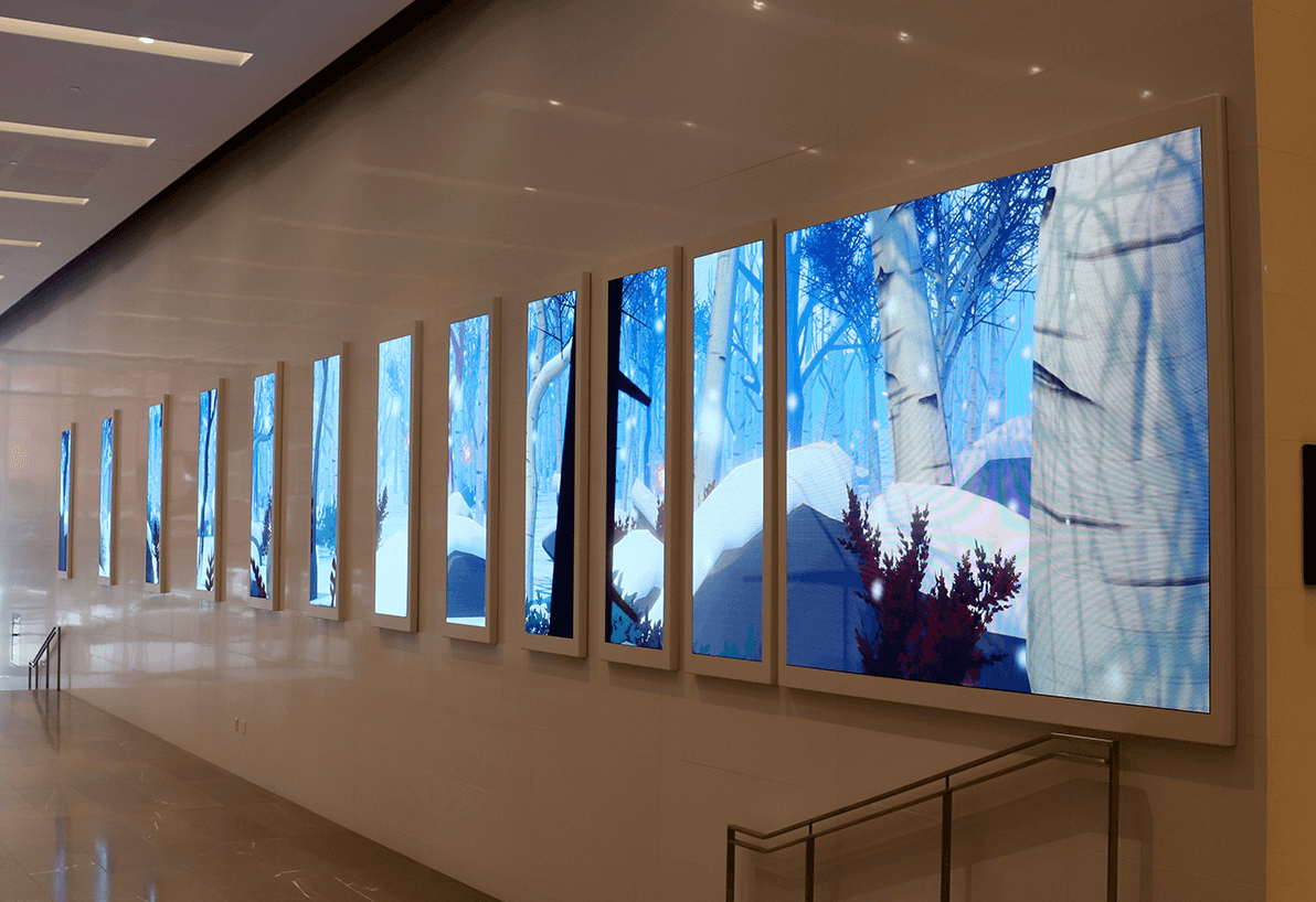 Designed by Forge Media, the 12 screens span 70 feet across the western wall of the lobby, greeting pedestrian traffic as they take their first steps into the building from the Front Street entrance.